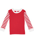 5.0 oz., 100% combed ringspun cotton 1x1 baby rib ; Heather is 88/12 combed ringspun cotton/polyester; White is sewn with 100% cotton thread; 5 oz. 100% combed ringspun cotton 1x1 baby rib; Heather is 88/12 combed ringspun cotton/polyester 1x1 baby rib; Ribbed collar and cuffs; Self-fabric back neck tape; Double needle bottom hem; Flatlock stitched seams; Side seam construction; EasyTear™ label; CPSIA compliant tracking label in side seam; Wear Snug Fitting. Not flame resistant. CPSC compliant yellow tag swift tacked to garment.; Machine washable/ tumble dry low; Fit: Toddler Unisex; Note: Color descriptions indicate Body/Trim colors, e.g. Kelly/ Red indicates Kelly shirt with Red Trim;