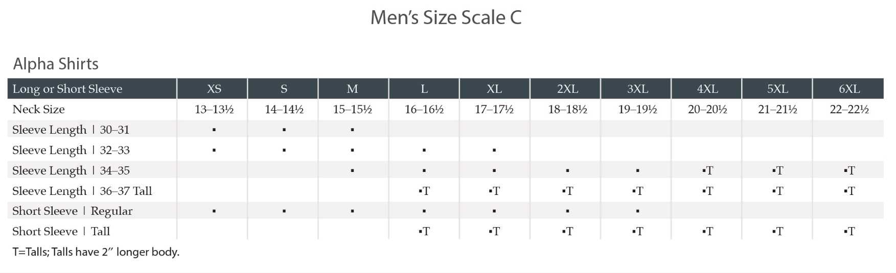 - Men's Sizes: Regular; S - 3XL; Talls; L - 6XL