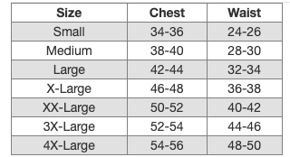 | Chest | 34-36 | 38-40 | 42-44 | 46-48 | 50-52 |