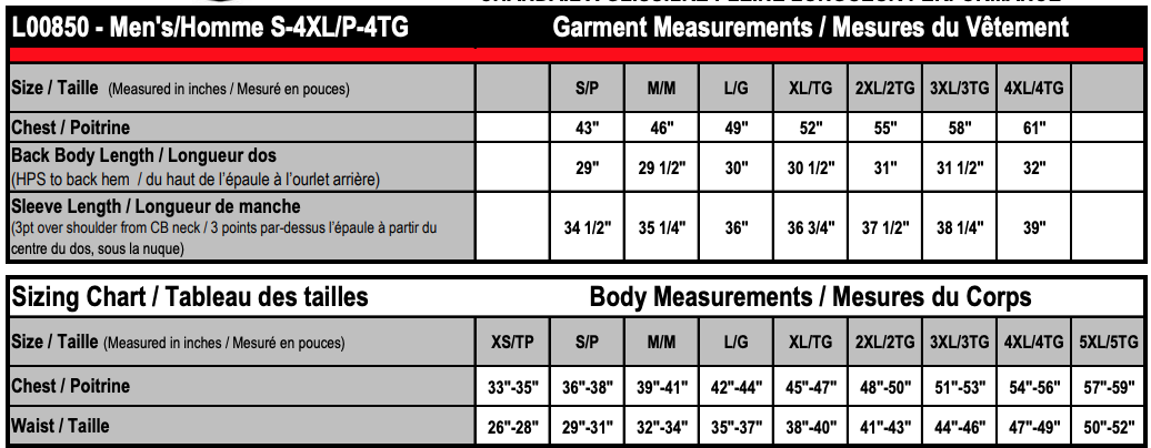 | Chest | 36"-38 | 39"-41" | 42"-44" | 45"-47" | 48"-50" | 44"-46" | 57"-59" |
