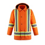 330 gsm – 9.7 oz./yd2 – 16.5 oz./lin. yd 100% cotton canvas with water repellent finish. Insulation: 220 gsm body, 170 gsm sleeves 100% polyester. Full body thermal quilted insulation. Snap detachable hood with adjustable drawcord. Rib knit storm cuff. 7 exterior pockets - 2 chest pockets, 2 side entry pockets, 2 lower front patch pockets with flap and 1 pocket on sleeve. Two interior pockets. YKK zipper. 4” hi-vis contrast band with 2” reflective tape on front and back body and sleeves. Meets CSA standards.