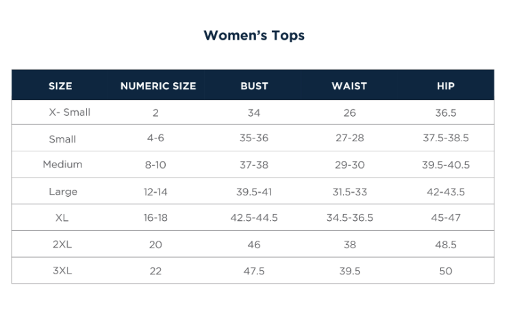 | Bust | 34 | 35-36 | 37-38 | 39.5-31 | 42.5-44.5 | 46 | 47.5 |