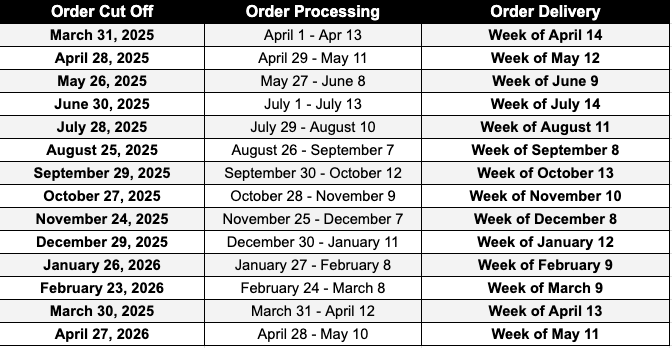 Below is the schedule of when orders will ship based on Order Cut-Off dates and prodcution schedules. It is important to ensure you have your order placed before midnight EST of the Order cutoff date to ensure your order ships out as per the schedule below. Any orders not placed by the cutoff date will automatically batch with the next cutoff date. All prodcuts are made to order, meaning they are produced in batchs based on the schedule below.